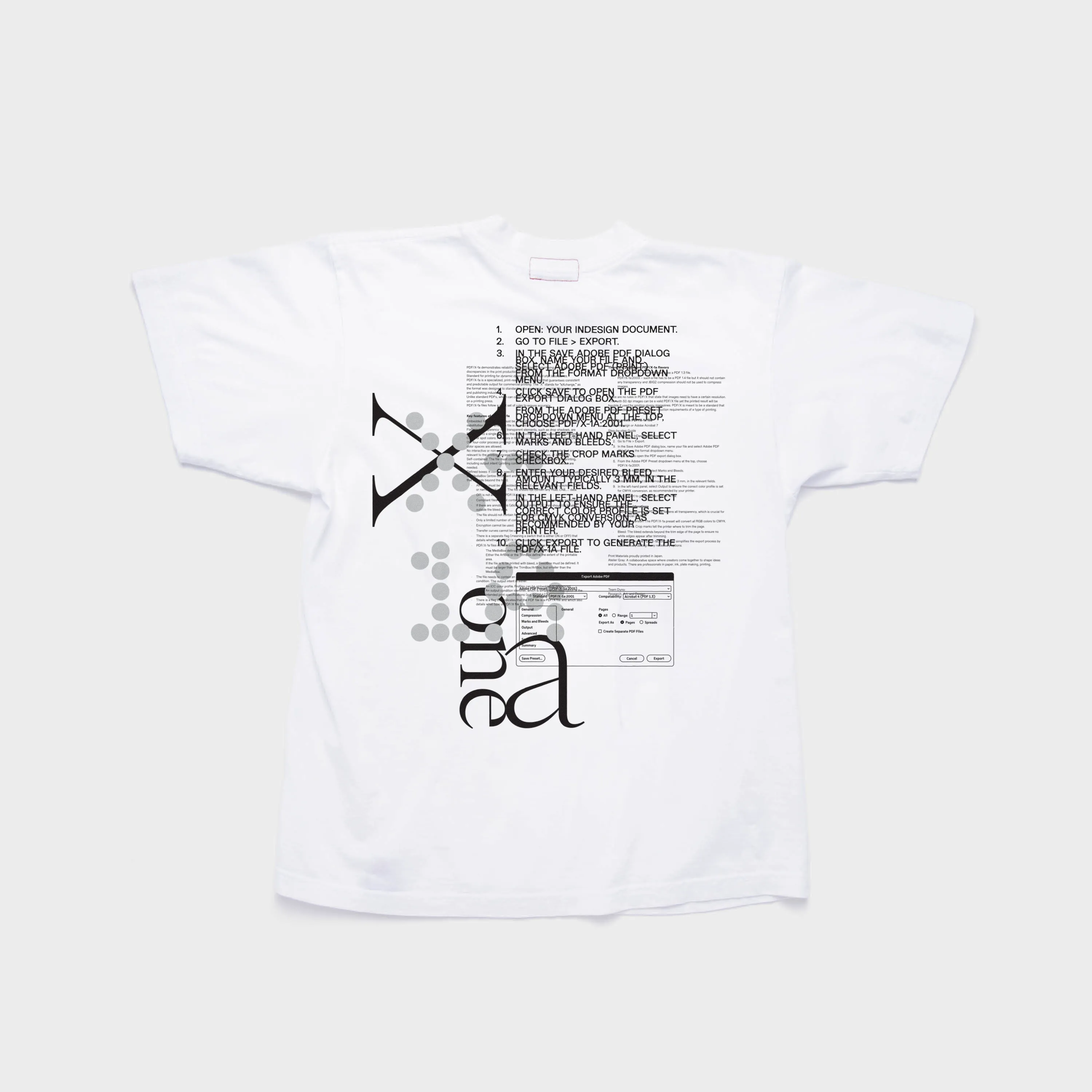 X1-A: the studio standard. Don’t know how to make one? Instructions printed on your back. Tomato & Ray Gun homage makes it look like your Mac threw up. For designers, printers, and art directors who speak production fluently. “X-1A” will come up. If they don’t know “X-1A”… school ‘em. In honor of our Art Director: X-1B.